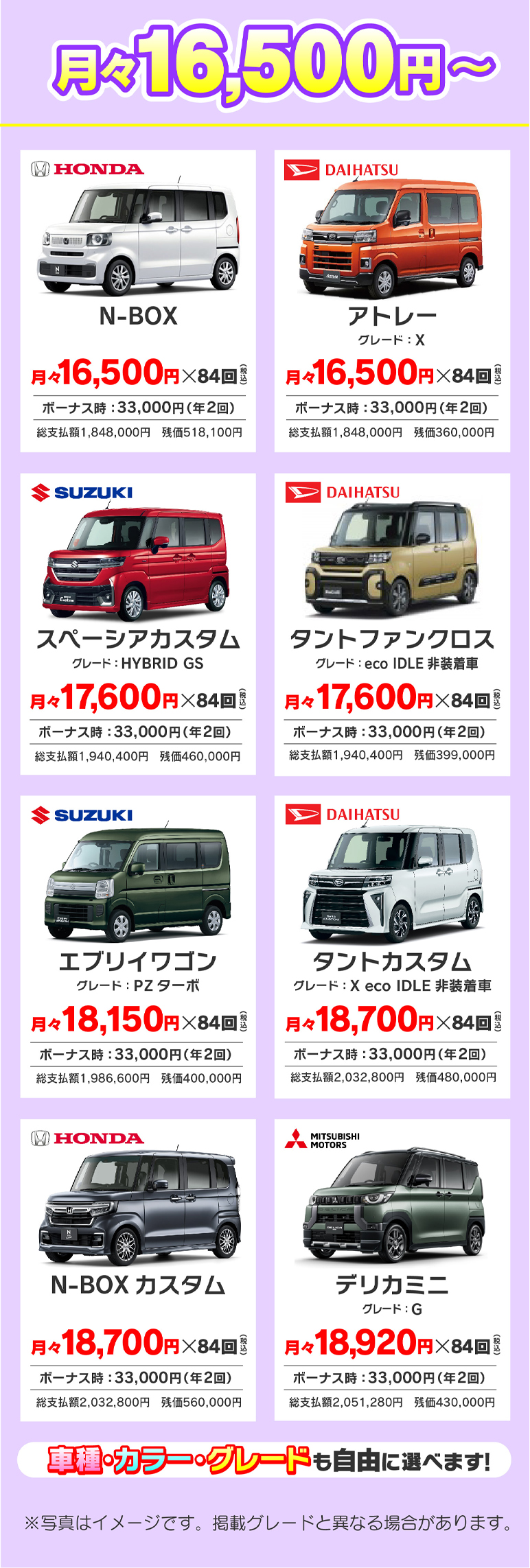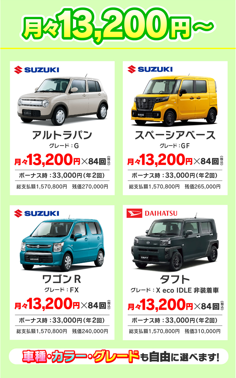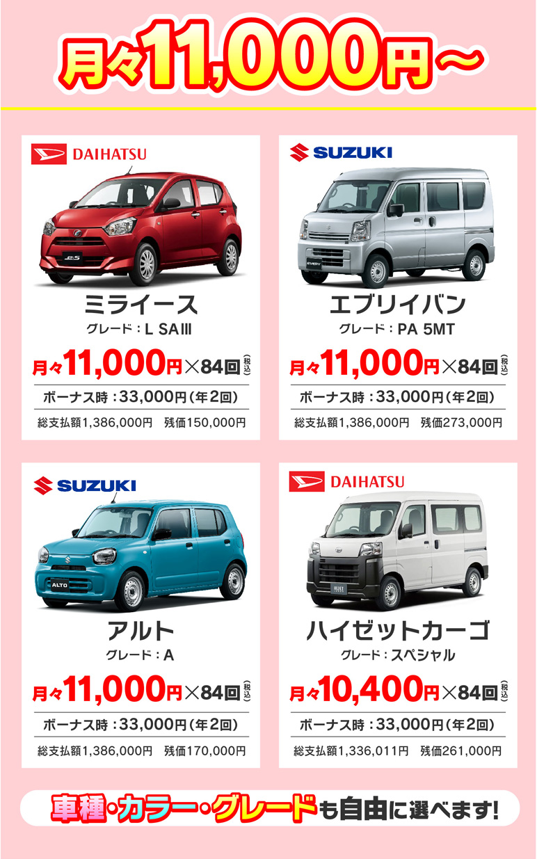 希望のグレード・カラーも選択可能です。
